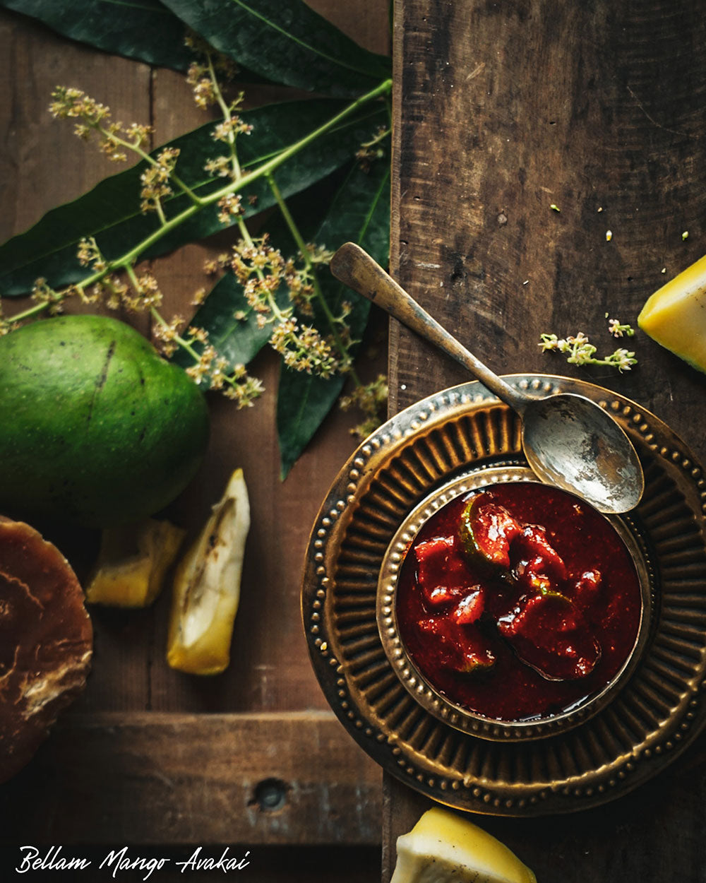 Mangoes, Jaggery, Garlic, Fenugreek Powder, Mustard Powder, Chilli Powder, Gingelly Oil, Salt.
