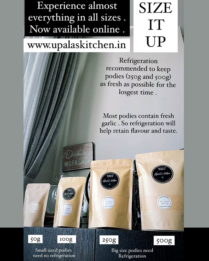 Made in authentic ways with the best of ingredients, perfectly roasted and ground to a powder/podi that goes as the best way to start of any meal with hot rice and ghee.